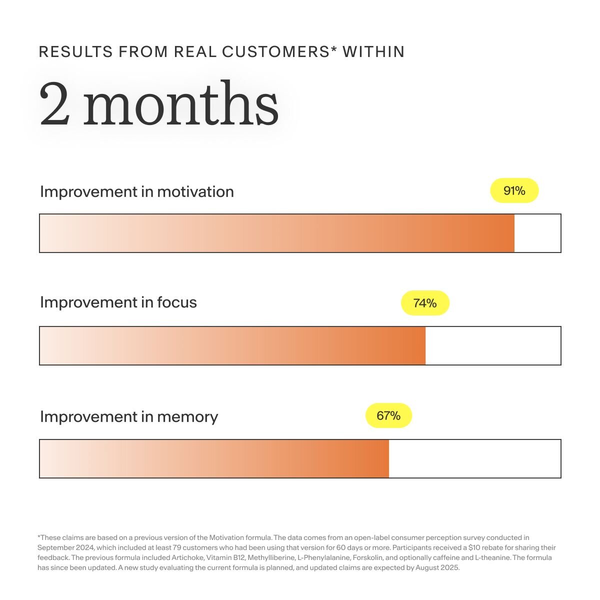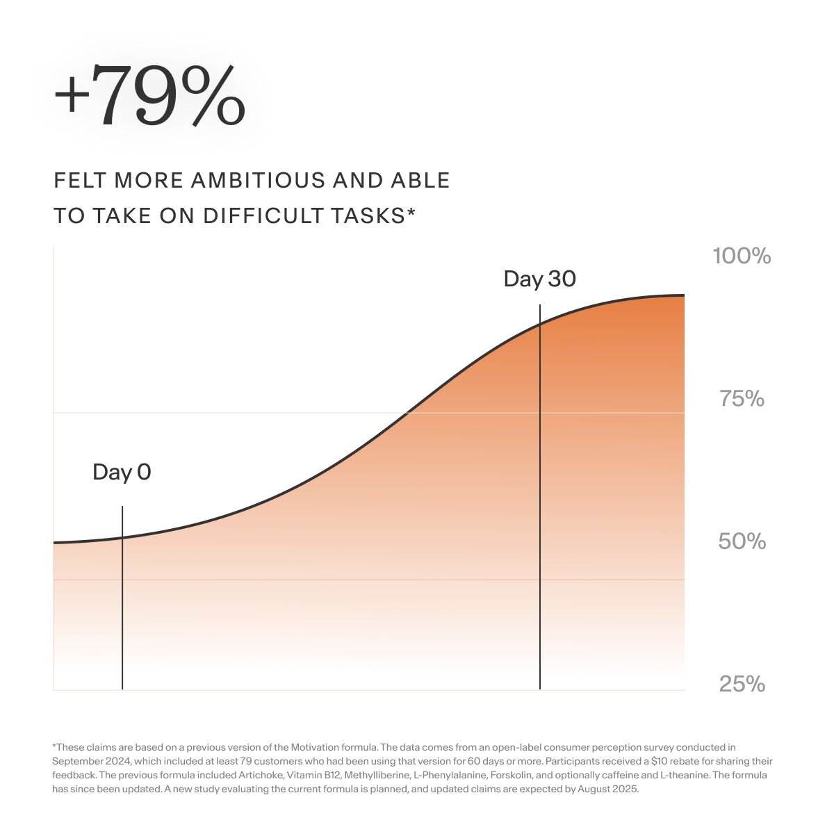 *These claims are based on a previous version of the Stress Reset formula, called Confidence. The data comes from an open-label consumer perception survey conducted in September 2024, which included a minimum of 37 customers who had been using that version for at least 60 days. Participants received a $10 rebate for sharing their feedback. The previous formula included Saffron, Ashwagandha, Magnesium, DHH-B, Zembrin®, and optionally caffeine and L-theanine. The formula has since been updated. A new study evaluating the current formula is planned, and updated claims are expected by August 2025.